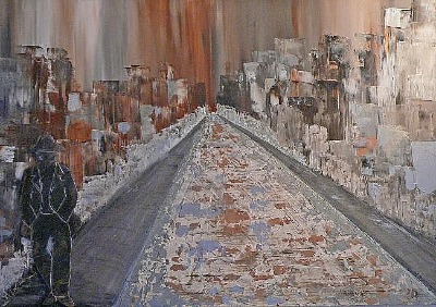 Kombinierte Spachtel- und Pinseltechnik mit einem Mann aus Sperrholz im Bild eingearbeitet.